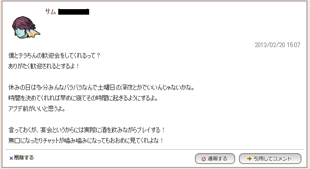 深イイ話~か~ら~の第2回ベストガイ選手権~プロローグ~ こんばんは。ディーンです。 ブログ開始&Mサイズハウスに引っ越して2週間ちょっと経ちました。 現在の我が家の状況。 1階 2階 そうなんです。 2階が引っ越した当時、とりあえずの気持ちで家具を適当にバラまき配置したまま 手つかず状態でゴミ倉庫と化しているのです。 ダストン大喜び間違いなしなこんながらくた屋敷にチムメンのティアラちゃんが 遊びに来てくれました。 「M家だ~!おっきーい!!」 M家に興奮するティアラちゃん。 興奮のあまり「2階には行かないで」という私の制止を振り切って階段を駆け足で昇ってしまいます。 「なにこれ!」 あぁ……だから行ってほしくなかったのに……。 「家具がいっぱいある!!」 そこ?そういうことじゃなくない? 積み散らかった家具を物色していくティアラちゃん。 本当にこの子は相変わらず無邪気だなぁと眺めているとなにやら郵便物が届いたようなので 興奮しきりなティアラちゃんを置いて郵便局に向かう私。 郵便物を受け取り、「そろそろ飽きた頃かな?」と思いながら帰路につくやいなや ティアラちゃんの甲高い悲鳴が家の方角から聞こえてきました。 「やばい!助けて!!」 「どうした!?」 「2階に物がありすぎてでられなくなったの!」 あぁ……だから行くなって言ったのに……。 その後なんとかティアラ嬢は脱出に成功したようでした。 帰るとスライムチャットが光っいたので確認すると、 ほんとに締め切ってある……。 「この先キケン。立入禁止」的なやつだろうか。 あれ? 隙間あいてるがな! 子供とか簡単に入れちゃうYO!ソーデンジャラス!! なんということだ。 前置きとしてちょこっとだけ自分の不精とティアラ嬢の身に起きた悲劇を 書くつもりが予想外の長さに。 でも本題はこのあと。ナンテコッタイ。 タタミマス 全てはこの男の発言からはじまった……。 ときは2013年2月。 サムが我らがチームに加入してまだ間もない頃のお話。 新メンバー歓迎会は我ら花天月地にとって最も古い伝統行事の一つです。 サムの歓迎会をやろうという発表を受け、当時まだ初々しかったサミーが チーム掲示板に以下のような感激の思いをぶつけます。 当時まだサムは知りませんでした。 花天月地には『ベストガイ選手権』なる男の誇りと名誉を賭けて行われる、 蚩尤族も真っ青な情け無用の残虐ファイトイベントがあることを……。 初代ベストガイである私はもちろんのこと、臥薪嘗胆の日々を重ねてきたきつつき・ドッポらもまた新たなる闘いを予感させるヒリヒリとした空気を肌で感じ取っておりました。 そんな張りつめた緊張感ただよう中、歓迎会の皮をかぶった男たちの仁義なき戦いが今! 始まりませんでした。 和やかに談笑する面々。 当日は、 私、きつつき、ドッポ、サム、テラオーガ隊員、カナヤンらに加えて ゲストとして伝説の女戦士ジーノと私のリアフレであるまえちこが参加。 天下の奇才ディエゴや魔法使い界における私の弟子にしてぶっちゃけ私など及びもつかないトップアスリート並みのスペックを誇るキヨトくんが遅れて参戦する予定でしたので、それまでしばらく上記の8人で談笑しておりました。 サムはしきりにテラオーガ隊員の出オチ感に嫉妬しておりました。 ちょっと変わった服装でこようと提案した張本人としての矜持が無残にも打ち砕かれた、 そんなウェディの悲哀を嫉妬の炎に変えて必死で己の立ち位置を死守しようとするサミー。 そんなサミーを私がイジり、きつつきとドッポがガヤ芸人として場を盛り上げ、カナヤンが優しくフォローする。 ちょっと自分は他の人とは変ってるところがあるかもしれない。 シャイな人見知りでなかなか人と打ち解けられない。 でも気の合う変人同士が集まって思い出を共有しあえればファミリーにだってなれるんだ。 丁々発止のギャグが飛び交いながらも、どこかそういったアットホームな雰囲気が出ていたんだと思います。 そんな雰囲気に惹かれてまえちこが我ら花天月地に加入希望を表明。 大喜びする一同。 当然のようにあの伝説を共有したかけがえのない戦友ジーノンにも打診をしたところ、 花天月地のアットホームな雰囲気には確かに惹かれるけど一つ尋ねたいことがあるとジーノンは言いました。 「チームってどういう存在なのかな」 歴戦の闘士として野良で活動することの多い彼女からすれば当然の疑問だったのではないかと思います。 そんな彼女に自分たちの想いを伝えようとする男性陣でしたがなかなかうまく言葉がでてきません。 そんな中、エロテロリストの異名を持つセクシー担当のカナヤンが口を開きました。 「チームってのはね」 「いつでも帰ってこれる場所だと思うよ」 あのときの感動は今でも忘れられません。 短い言葉かもしれない。当たり前の言葉かもしれない。 でも私たちが言いたかったその全てがカナヤンの言葉にこめられていました。 一同感動にうち震える中、この言葉を聞いたジーノンも