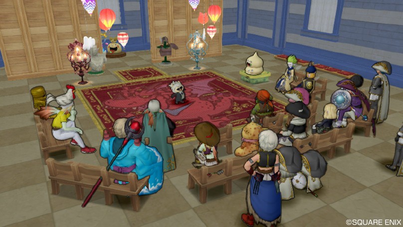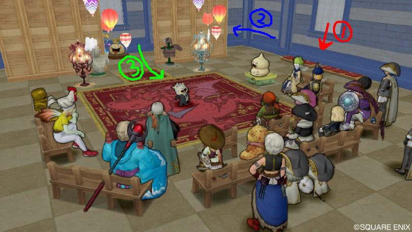 【ドレスアップ】第1回アストルティアコレクション②【コンテスト】 おつかれサマンサ!ディーンです。 前回タイトル詐欺かっていうくらい半端なところで終わっちゃいましたが、今日こそ書きますよ。アストルティアコレクション。 ふー、それにしても腹がへったな。 え?早く本題に入れって? 年末年始の暴飲暴食がたたって腹具合が本調子ではありませんが人一倍食い意地が張っている私、腹だけはいつもへるものです。 それでも多少は胃腸に優しさを垣間見せねばならぬと今日はうどんでもすすることにします。 今日は某さぬきうどんのお店にお邪魔して私の大好物をいただきます。 めんたまうどん さぬきうどんを一躍全国的ブレイクまで持っていった立役者のかまたまうどんはみなさん御存じでしょう。 これはそんなかまたまうどんのネクストステージ。 かまたま×めんたいこの織りなす無限のコラボレーション。 卵と明太子、そしてバターが絶秒に絡み合い爆発的なうまさを発揮する逸品です。 やべ、醤油かけすぎた。 まぁいい。このくらいが美味しいんですよ。 あとは豪快にかきまぜて…… 卵、明太子、バターが存分に絡み合ったのを確認し…… 一気にお口へゴートゥヘル!! ………… ごちそうさまでした。 腹ごしらえもすんだのでちゃちゃっとたたみやす。 さて、前回に引き続き、といいますかここからが本編といいますか。まぁこまけぇこたぁいいんだよ!うどんをすすって元気100倍!『花天月地プレゼンツ・秋のパンツ祭り☆アストルティアコレクション』綴ります! 入団の儀を終え、チムメンならびにゲストの皆様がカジカ邸の2Fにのぼると、イベント参加者の皆さんをこの男が出迎えます。 「レディース&ジェントルメン!」 「花天月地プレゼンツ!ドレスアップコンテストを開幕します!」 コンテスト会場のクオリティ、そして怪しげなアストルティアのタモリと化したきつつきに驚いた参加者のみなさんから驚嘆の声があがります。 家主のカジカちゃんが丹精込めて作り上げ、さらに本イベントの司会進行役のきつつきが手を加えたこのコンテスト会場。 本当に素晴らしいクオリティで私まで鼻高々。 ま、私はなにもやってませんけどネ! 本コンテストについて簡単に説明させていただくと、この宴会に参加していただいた方の中からコンテスト参加希望者を募り、それ以外の方には観客及び審査員になっていただきました。 コンテスト参加希望者の動きとしては、まず上の写真の①のところに待機し、 司会のきつつきの指示に従って順番に②のように舞台裏に移動します。 次にきつつきの合図で③のように舞台に登場して自慢のドレスアップ装備をお披露目するという流れ。 なので、コンテスト参加希望者は①・②の時点ではレンタル衣装などを着用して本番のドレスアップ装備が事前にネタバレしないようお願いしていました。 ②で着替えて、③でババーンと登場。歌舞伎の早替わりのような感じですね。 参加者全員のお披露目が終わったら審査員の方々に自分が気に入った人にいいねで投票してもらいます。得票数が一番多い人が優勝っつーわけです。 少し話はそれますが、今回のイベントを企画するに当たり、司会はきつつきこと兄さんしかいないと思っていました。 花天のファッションリーダーであるきつつき。 誰よりもドレスアップが大好物なきつつき。 しかし、プクリポという種族の壁が立ちはだかりなかなか自慢の装備が目立たないきつつき。 そんな、ドレスアップの光と闇を知り尽くしたきつつきにこそ今回の企画の司会がふさわしいと思ったのです。 きっと兄さんも喜んで承諾してくれるだろう、そうタカをくくっていた私は軽い気持ちで彼にお願いしてみました。 「……ってな感じで兄さん司会頼むわw」 「ちょっと確認したいことがある」 「えっ」 「ディンの返事次第じゃ司会は引き受けられない」 な、なんだってぇ~!? 思いもよらぬ事態にテンパりながらも兄さんの言う確認事項とやらに思いを巡らせます。 強ボスに行ったときに投げてもらった聖水を返さなかったことだろうか? それとも昔もらったヘナトス腕装備のお返しをしなかったことだろうか? ハッ!もしかしてうにゅちゃんが冗談で「きつつきさんが裸で追いかけてきて困ります」と私に相談したことを一大不祥事のようにチムチャで取り上げたことだろうか!? あぁ~どうしようどうしよう。どんなアンサーをすれば兄さんは引き受けてくれるのか。 悩みすぎてちょっと頭痛くなってきたよ、うおおおん。 「司会でも参加者としてコンテストに出ていいかい?」 「この出たがり屋さんめ!」 まったくの杞憂でした。兄さんのお披露目タイムは私が代理で司会を務めるということで話は決着しました。 ドレスアップに賭ける兄さんの執念を垣間見た瞬間でしたが、私だって負けていません。 本コンテストの前身ともいえるベストガイ選手権の第1回及び第3回王者である私は優勝候補筆頭といっても過言ではないでしょう