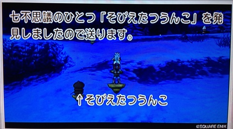続 友からの書状 こんばんは。 ディーンです。 上の写真はグレンでいかがわしい行為を目撃して固まる私です。 固まりついでにたたみます みなさんバージョン2のあれやこれやで忙しい毎日を送られていることと思いますが、 七不思議というコンテンツ、覚えていらっしゃるでしょうか。 もうコンプリートしたよって方もいればそんなのやる暇なくて放置してるよって方もおられるかと思います。 私はバッチリ後者なんですが、先日フレのせいろがんさんから七不思議に関して気になるお話をいただきました。 お腹の助っ人・ラッパのマークのせいろがんさん 「七不思議の一つを発見することができたので送ります」 放置していたとはいえいずれは自分の力で発見したいと思っていた七不思議。 せいろがんさんには失礼ですが、若干ネタバレになってしまうのは正直不本意でしたがせっかくのご厚意。ここはひとつありがたく拝見させていただきます。 キテマスキテマス。 ネタバレしたくない方はここから先、お気をつけください。 それでは。 御開帳~♪ なんだこれ。 うんこっていうかこれちゅぴぞーだ。 絶対ちゅぴぞーだ。 ちゅぴぞー 先日謎の手紙を寄こしたお茶目さん あぁ~。 わかったわかった。 前回の手紙は、 『俺こそがうんこ!うんこ王ちゅぴぞーとは俺のことよ!』 そういうアピールだったということか。 せいろがんさんはちゅぴぞーからの謎の手紙で悩んでいた私を見かねて種明かしをしてくれたわけか。 さすがはお腹の救世主せいろがん。 腹痛のみならずお悩み解消にも効能があるようです。 ちゅぴぞー、せいろがんさんの両名が属するアストルティア有数のコント集団・じょうつよ団は今日も元気に活躍中!てなわけでじょうつよ団と親しいきつつき(捕食間近)のランキングバナーをクリックしていただければじょうつよ団が世界を救う日も近いかもしれません! ドラゴンクエストX ブログランキングへ PR